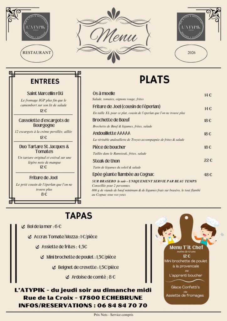 Arrivée d’une carte de Whiskies & de Rhums sélectionnés. Nouveaux cocktails, un Tivoli pour vous mettre à l’abri du vent et des intempéries, ouverture le dimanche midi et désormais L’ATYPIK propose aussi des frites !